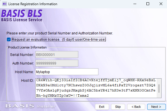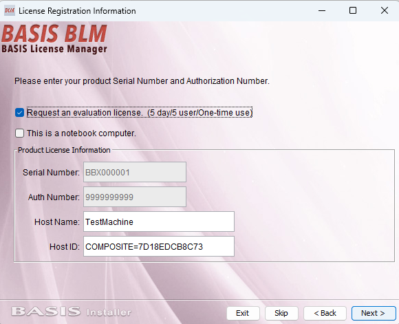Demo serial numbers and authorization numbers may be requested when installing the BLM/BLS. All demo serial numbers are required to be registered on the specific hardware they will be installed. The demo license is a 5-user/5-day license. A BASIS licensing product, such as the BASIS License Manager (BLM ) or the BASIS License Server (BLS) software, is required to register all serial numbers. The revision of the product you install will determine which licensing product you will require. Revisions 2 through 21 of our language will require the BLM, while any revision 22 or greater will require the BLS.