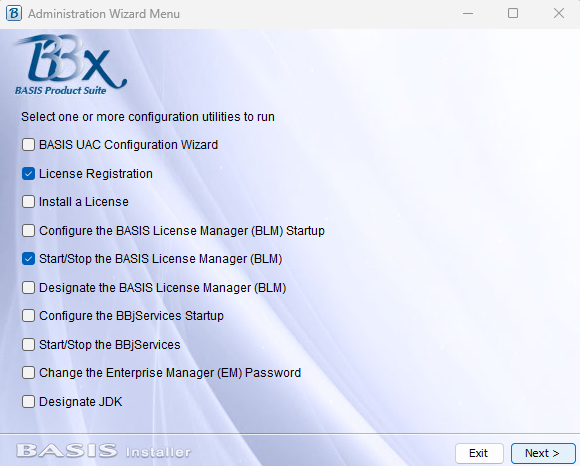 If you have BBj/BBx installed, your screen using the BBj Admin wizard is slightly different: