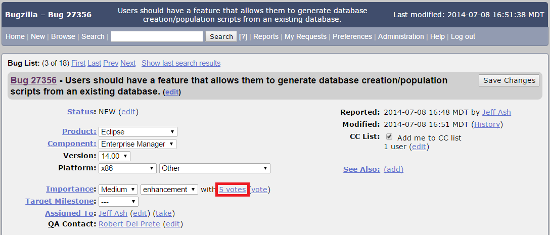 Figure 2. A Bugzilla Eclipse product bug with 5 votes